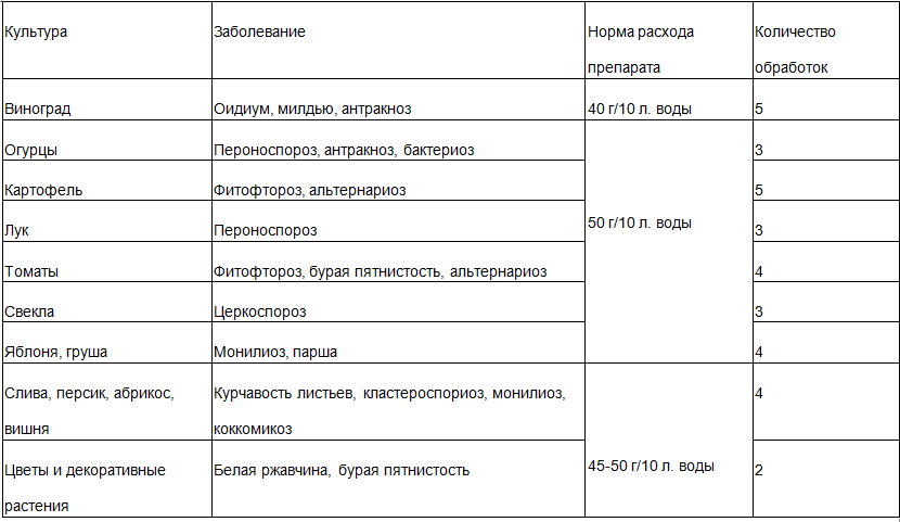 | Виноградная лоза | Милдью, оидиум, антракноз | 4 г | 5 раз |