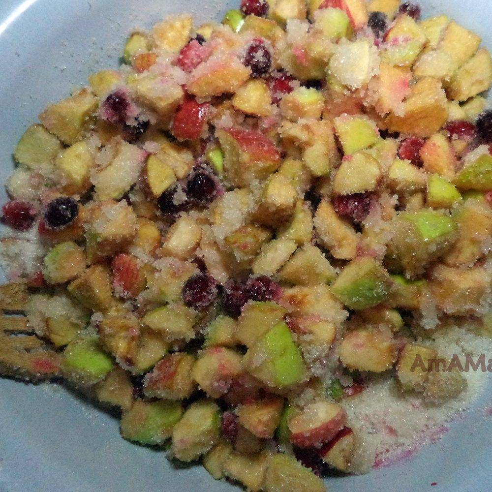 - Ягоды и яблоки промыть в прохладной воде, обсушить. Яблоки очистить от семенной коробочки и нарезать кусочками среднего размера. Добавить к ним бруснику (брать только целы хорошие ягоды). Засыпать сахаром и дать постоять 2-3 часа, чтобы фрукты пустили сок (можно и сразу варить, только надо активно все перемешивать, пока сок не выделится).