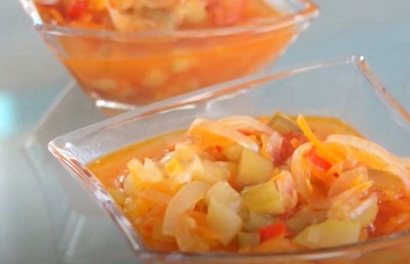 К ингредиентам этой заготовки на зиму добавлены несколько овощей: сладкий перец, соус из помидор и морковь. Салат подойдет не только к гарнирам и мясу, но может быть и самостоятельной закуской. Кабачок считается уникальным овощем, даже после термической обработки практически не утрачивая полезных микроэлементов.