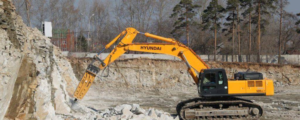 - Тяжелые гидравлические молоты – довольно-таки мощное навесное оборудование. Энергия удара данных гидромолотов составляет более 3500 Дж. Такая «тяжелая артилерия» устанавливается только на сверхмощные экскаваторы на гусеничном ходу. Применяются тяжелые гидромолоты при прокладывании тоннелей, во время строительства подземных веток метро, в карьерах по добыванию гранита, базальта и прочих сверхпрочных полезных ископаемых.