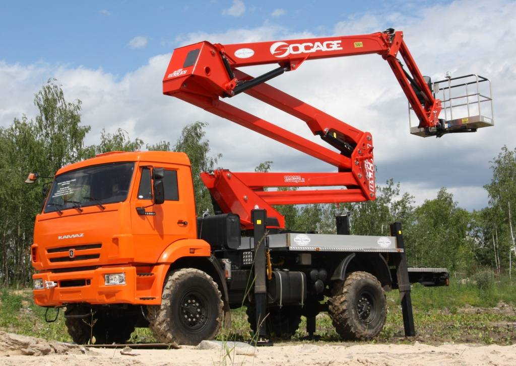 Комбинированная автовышка Socage DAJ-332 на шасси повышенной проходимости КамАЗ-43118 (6х6) предназначена для проведения строительно-монтажных работ на высоте до 32 метров на объектах с плохими подъездными путями. Автовышка оборудована электроизолированной люлькой, позволяющей оператору проводить работы на линиях электропередач и связи под напряжением до 2000 В без отключения электроэнергии.