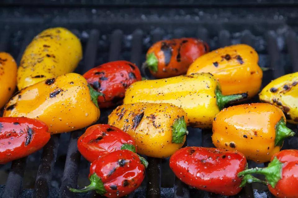 - Баклажаны, помидоры, болгарский и перец чили — промыть. Выложить на решетку гриль и запечь над углями. По готовности охладить, снять запеченную шкуру. Нарезать на кусочки, убрав в удобную емкость.