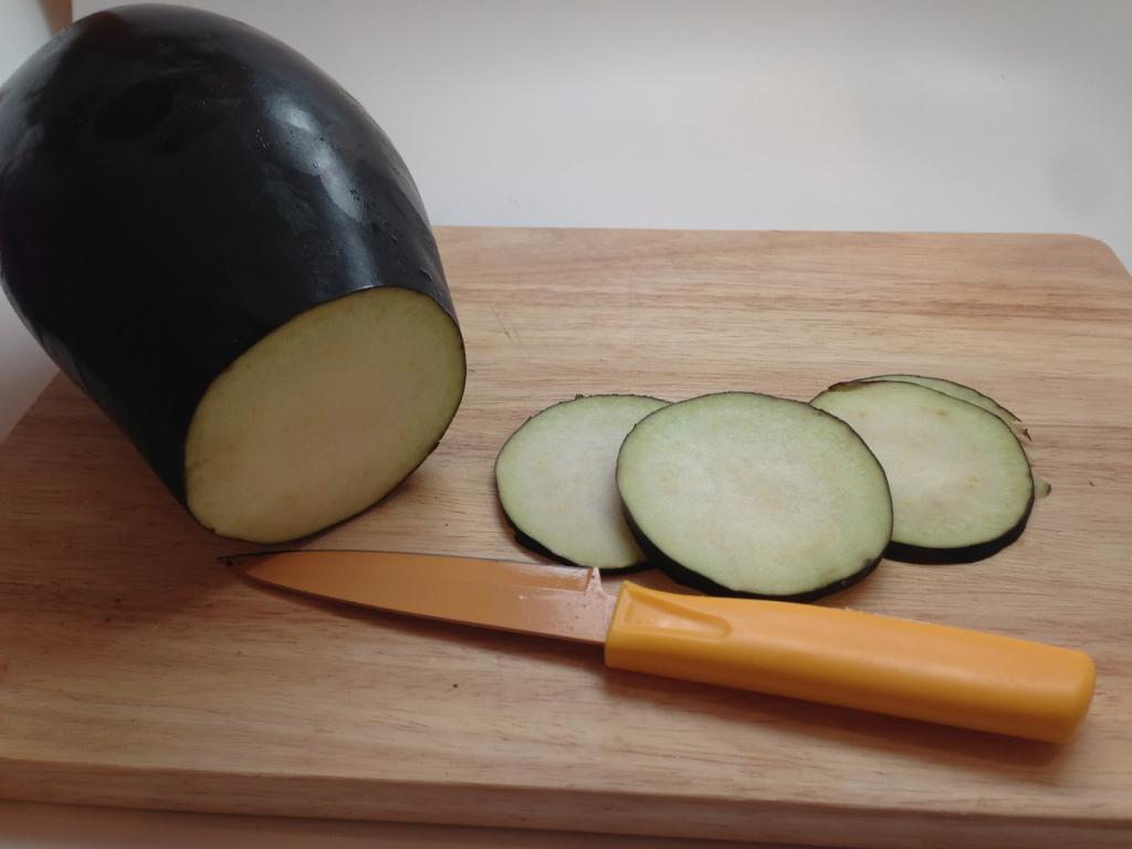 - Кожуру синеньких срезаем. Делим плод на две части вдоль. Затем каждую половину нарезаем на пластины.