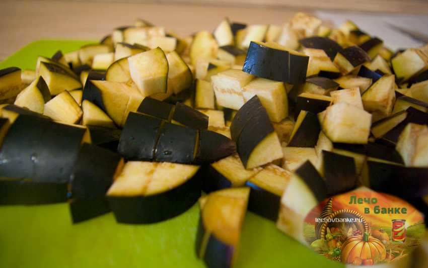 Занимаемся другими компонентами. Очищаем лук от шкурки. Нарезаем его небольшими кубиками. Сладкий перец очищаем от внутренностей и семян. Рубим его кусочками (кубиками). Синенькие плоды нашинкуем кубиками средних размеров.