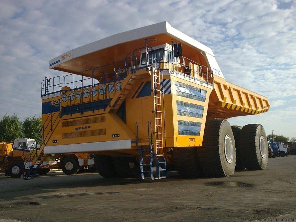 Уникальный карьерный самосвал предназначен для перевозки горной массы в сложных горнотехнических условиях глубоких карьеров, на открытых разработках месторождений полезных ископаемых по технологическим дорогам в различных климатических условиях эксплуатации при температуре воздуха от минус 50 до плюс 50 градусов Цельсия. Самосвал БелАЗ-75710 может перевозить до 450 тонн груза за раз.