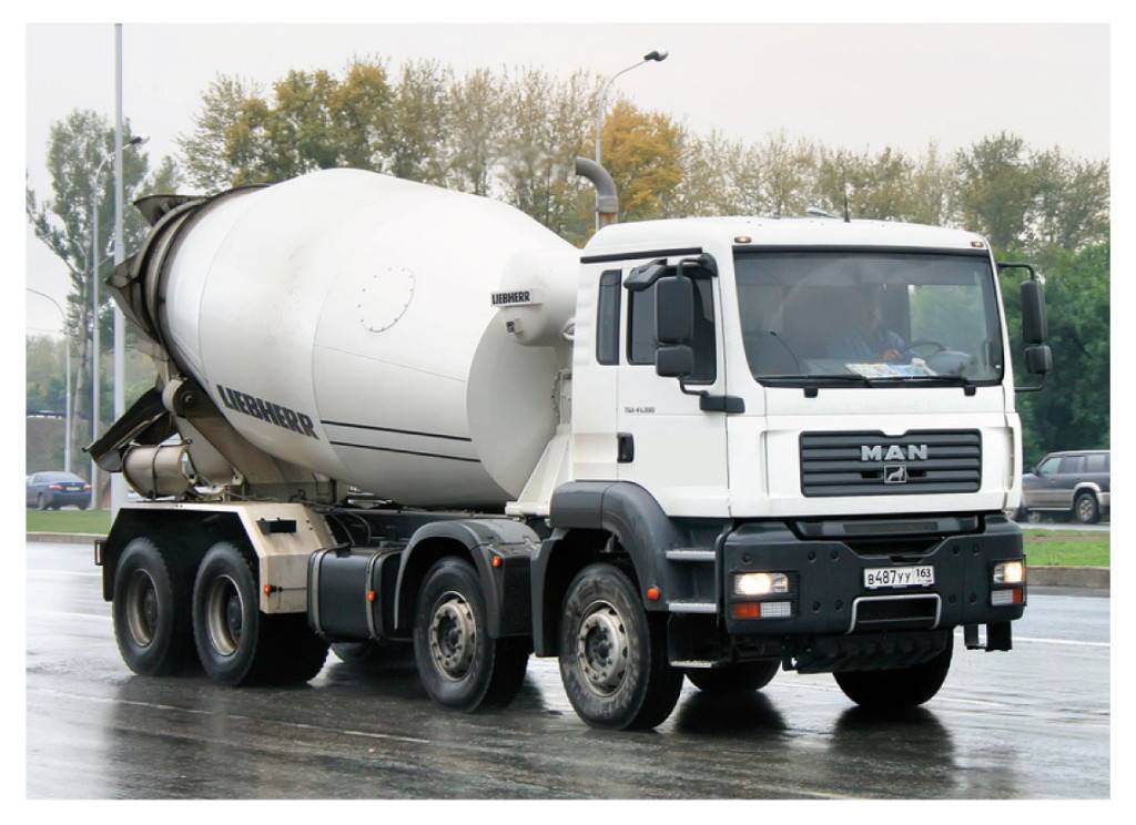 На площадку бетон доставляют в бетоносмесительной конструкции, прикрепленной к автомобильному шасси. В железной емкости вращаются лопасти по часовой стрелке, двигая раствор внутрь. Обратный процесс подталкивает смесь по лопастям в сторону выгрузного отверстия.