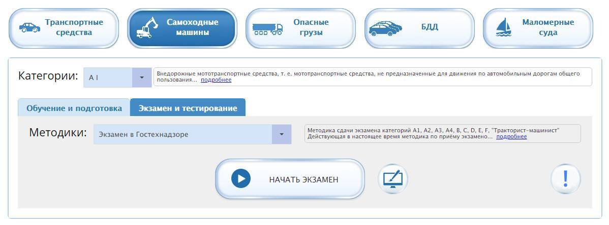 по билетам по безопасной эксплуатации самоходных машин, эксплуатации машин и оборудования для получения удостоверения тракториста категорий «А1», «А2», «А3»,«А4», «В», «С», «D», «Е», «F» и получения профессии тракториста-машиниста, так же, как эти экзамены сдают в инспекции Гостехнадзора;