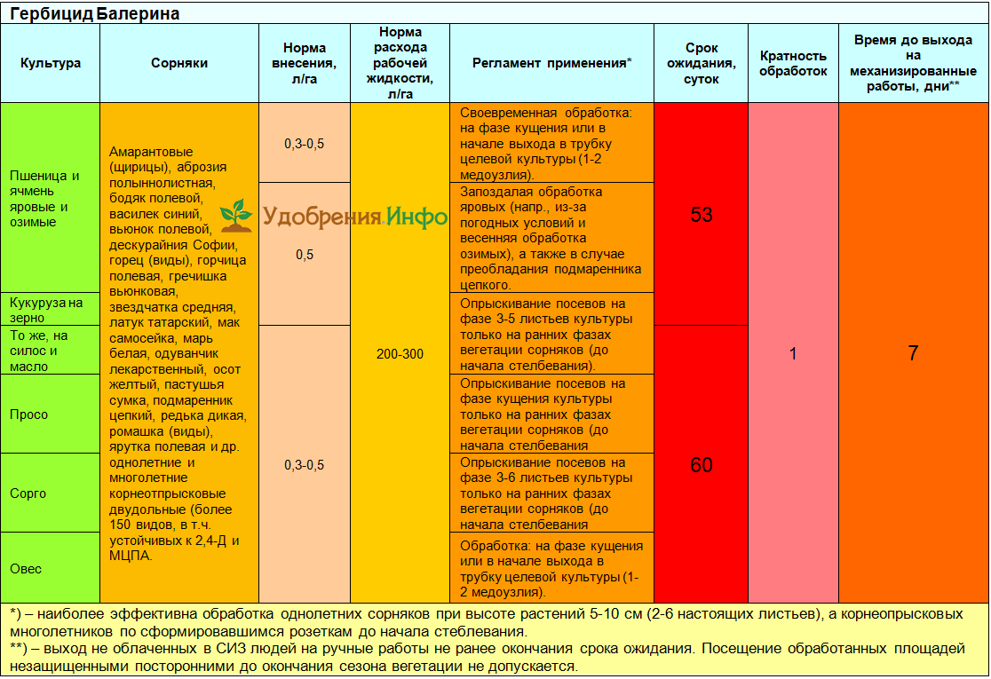 Инструкция по применению гербицида Балерина приведена в табл.: