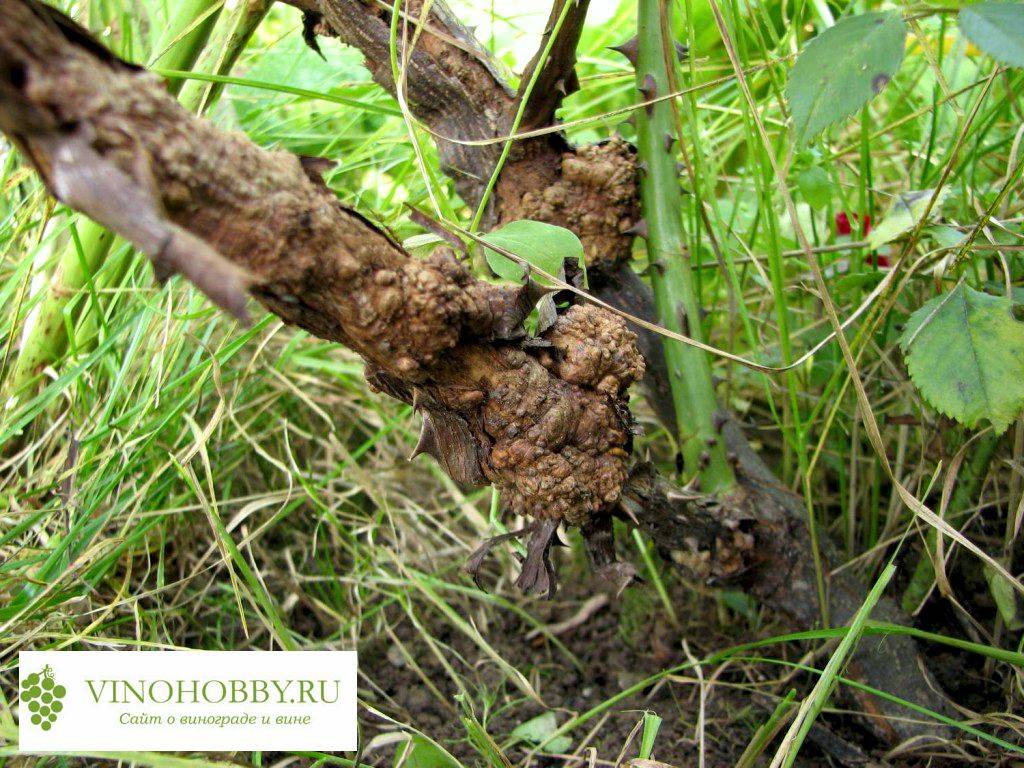 Так называется опасная и не поддающаяся лечению болезнь, вызываемая бактериями. Проявление — наросты на лозе. В первые два года резко снизится урожайность, а в дальнейшем пораженное растение полностью пропадет. Это одна из неизлечимых болезней культуры. Ближайшие два года на этом месте виноград лучше не сажать.