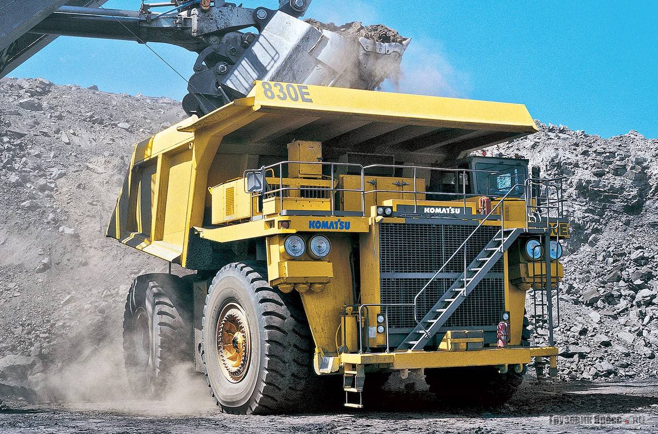 Самосвал Komatsu 830Е-АС также оснащён приводом переменного тока, эксплуатационная мощность двигателя 2360 л.с./ 1761 кВт, максимальная – 2500 л.с./ 1865 кВт. Грузоподъёмность машины превышает 221 т при максимальной ёмкости кузова 147 м3.