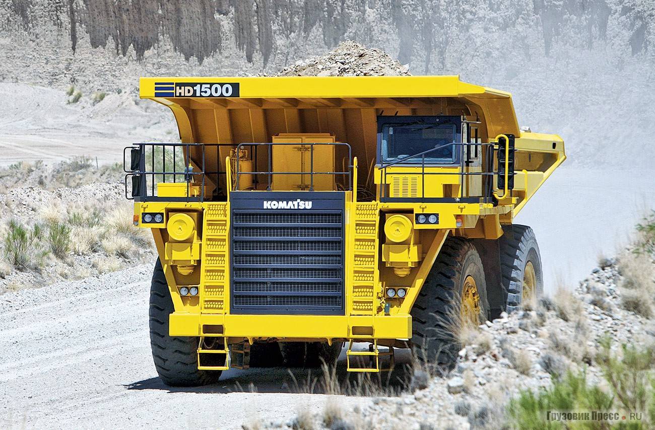 Komatsu HD1500-7 – самый тяжёлый самосвал с гидромеханической передачей. Рекомендуемые для работ с ним экскаваторы с ковшами объёмом до 12 м3. Его грузоподъёмность 144 т при полной массе почти 250 т. Вместимость кузова 54 или 78 м3 (геометрическая и «с шапкой»). На машине установлен 12-цилиндровый двигатель Komatsu SDA12V160 мощностью 1406 л.с./ 1048 кВт при 1900 об/мин. Этой мощности достаточно для разгона гружёного самосвала до 60 км/ч.