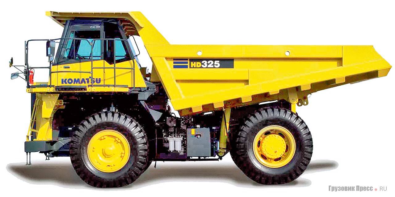 Самый маленький самосвал семейства – Komatsu HD325-6 – рассчитан для работы с экскаваторами с объёмом ковша до 4 м3. Он оснащается рядным 6-цилиндровым двигателем Komatsu SAA6D140E объёмом 15,2 л с непосредственным впрыском топлива, турбонагнетателем и вторичным охладителем нагнетаемого воздуха мощностью 488 л.с./ 364 кВт при 2000 об/мин. Каждый цилиндр имеет четыре клапана и соответственно два впускных спиральных канала, в которых создаётся завихрение подаваемого топлива. Такое решение обеспечивает двигателю лучшие экономические показатели в своём классе. Грузоподъёмность самосвала 36,5 т. Кузов ковшового типа может предлагаться в двух вариантах: для транспортировки глины, песка или гравия и скальной породы. Геометрическая ёмкость кузова – 18 м3, «с шапкой» – 24 м3. Максимальная скорость автомобиля с полной нагрузкой – до 70 км/ч.