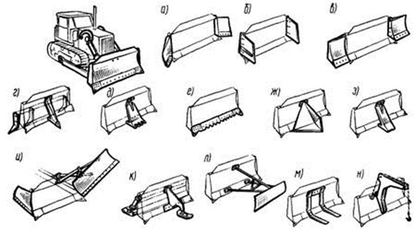 а — уширители, б — открылки, в — удлинители, г — передние и задние рыхлительные зубья, д — кирка для взламывания асфальта, е — ножи для разработки высокопрочных грунтов и наледей, ж — кусторезная приставка, з — канавная надставка, жесткий и и — гидроуправляемый откосник и откосник-планировщик, к — передние и задние лыжи для точной планировки грунта, л — отвальная приставка для работы от стенки, м — грузовые вилы, н — грузоподъемный крюк.
