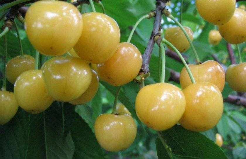 Само название сорта говорит о том, что ягоды черешни окрашены в яркий «золотой» цвет. Однако если деревце было высажено на открытом месте и плоды хорошо освещаются солнцем, тогда допустимо появление розоватого оттенка.