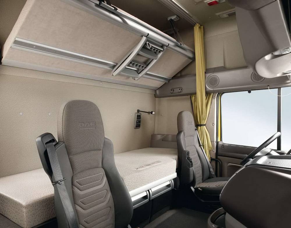 Кабина тягача даф отличается удобством и простором. В этой модификации используется версия Super Space. Подобная модификация комфортного салона считается самой удобной среди многочисленных продуктов подобной категории, представленных производителем DAF. Сиденья выполнены из качественной, пропускающей воздух ткани, в которой присутствуют элементы и дизайнерские детали, выполненные из натуральной кожи. Водитель и пассажир на таких сиденьях чувствуют себя очень комфортно, тем более, что присутствует еще и специальная сбоку расположенная поддержка.
