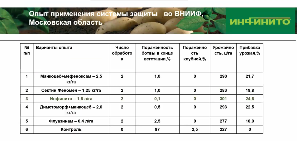 Фунгицид поможет спасти картофель и его клубни от фитофтороза и альтернариоза, для этого нужно обработать посадки культуры средством, приготовленным по инструкции. Рабочий раствор делается следующим образом: в 3 л воды растворяют 10 мл средства и тщательно размешивают. За сезон допускается проведение не более 4 обработок кустов картофеля. На каждую сотку площади расходуется до 6 л готовой рабочей жидкости. Последнее опрыскивание препаратом Инфинито можно осуществлять за неделю до сбора урожая.
