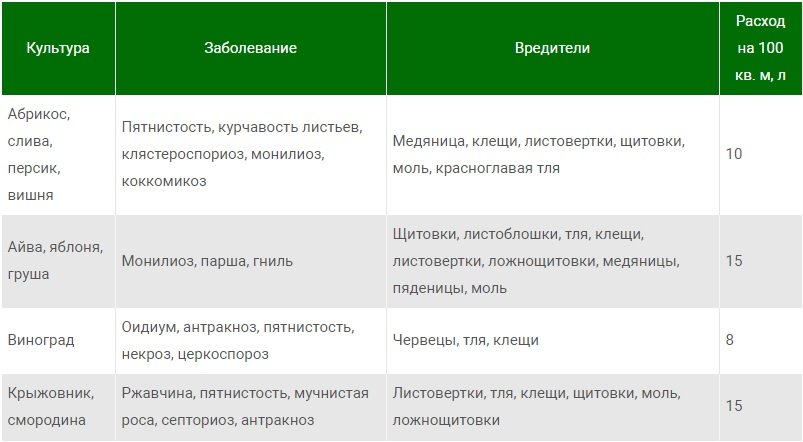 Своевременная обработка не даст развиться на деревьях парше, гнилям и манилиозу. Также инсектофунгицид уничтожит тлю, листоверток, щитовок, клещей, медяниц, моль, листоблошек и пядениц.