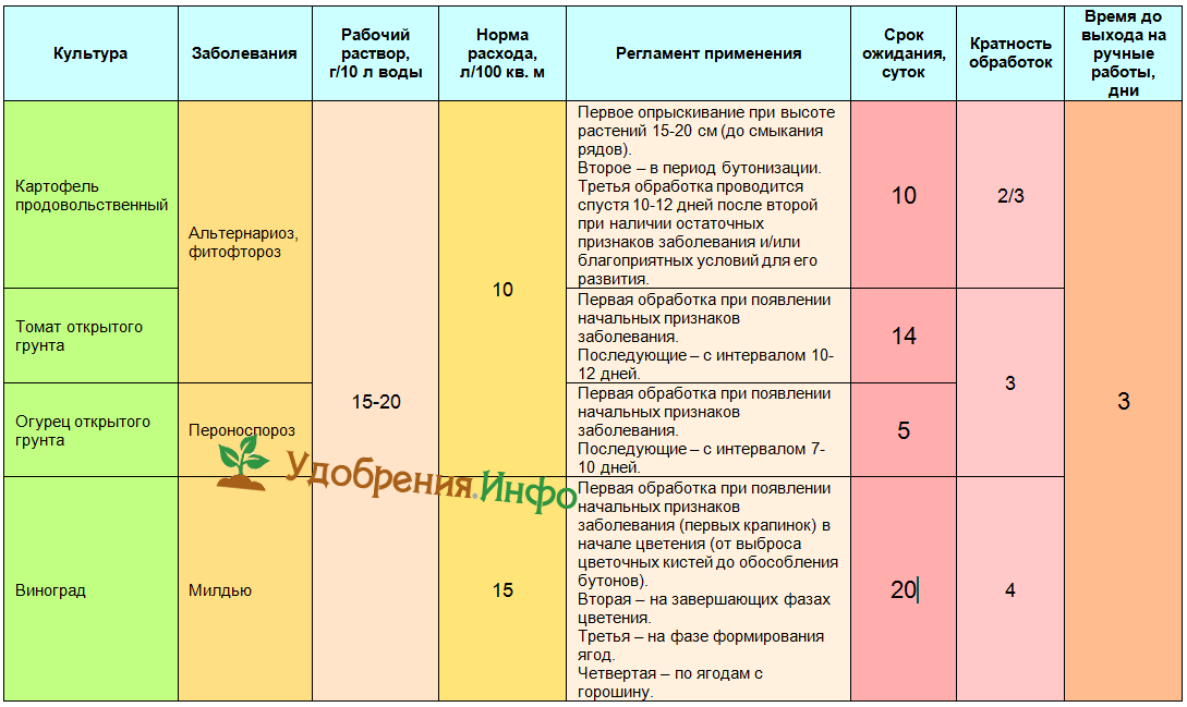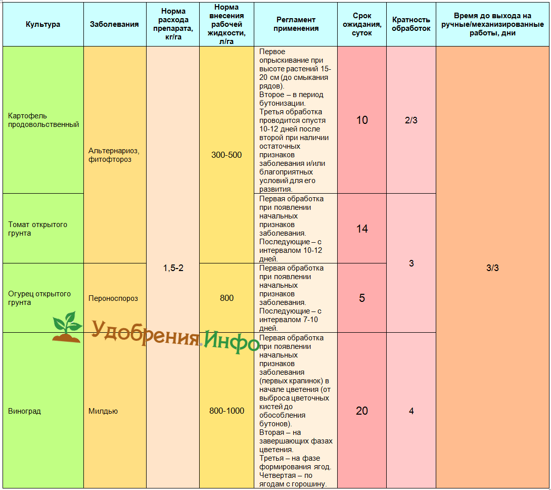| Картофель | Фитофтороз Макроспориоз | 15 – 20 г на 10 л воды | 1л на 10 м2 *зеленой массы | Первое опрыскивание – после прорастания всходов, в стадии 8 – 10 см высотой. Каждое последующее – через 10 – 12 дней. Общее число обработок – не больше четырех, с обязательным **сроком ожидания — 20 дней. |