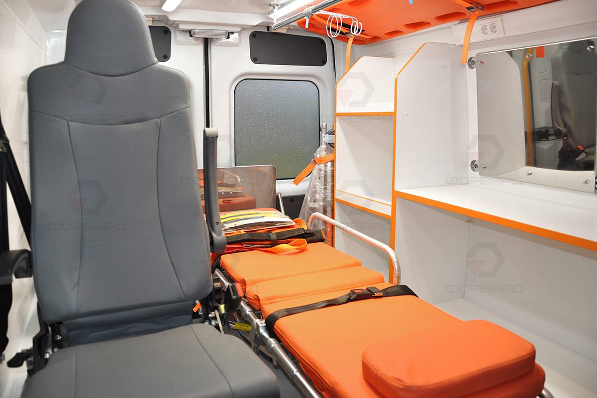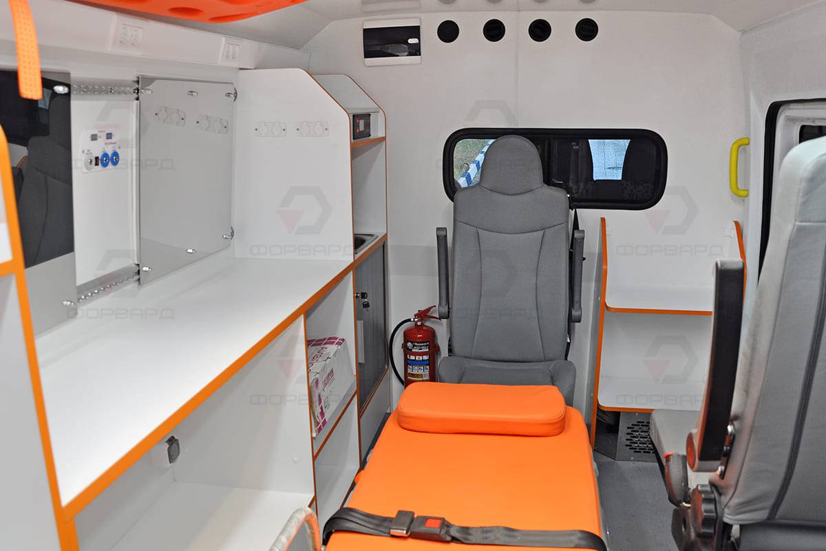 Салон и кабина водителя разделены перегородкой со сдвижным окошком. Пространство внутри медицинского отсека светлое и функциональное — здесь есть все необходимое для подобных автомобилей оборудование: три кресла для бригады медиков, полностью светодиодное освещение, кислородные баллоны, газовая разводка, раковина с краном и многое другое.