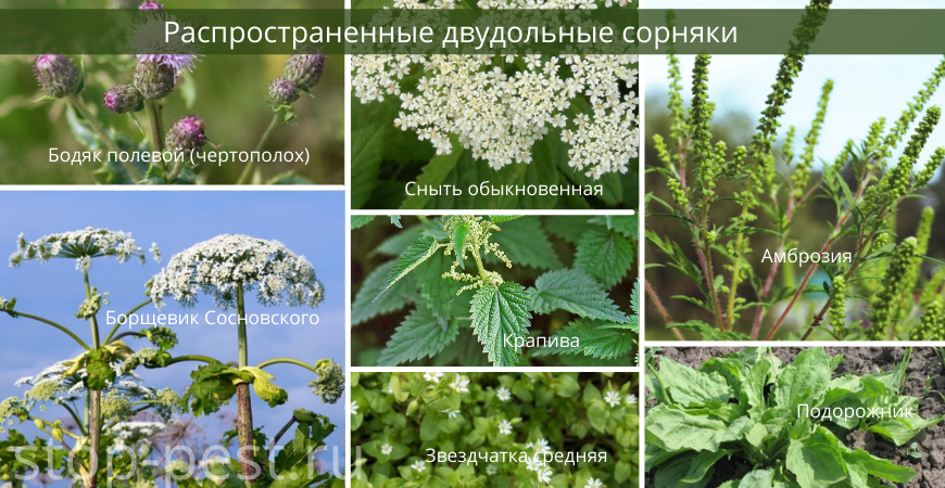 Самые распространённые растения этого семейства – крапива, одуванчик, бодяк полевой (народное название — «чертополох»), подорожник, сныть обыкновенная, вьюнок, звездчатка, амброзия. Кстати, борщевик Сосновского также относится к двудольным сорнякам.