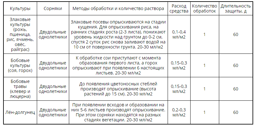 | 10-15 | Пшеница и ячмень яровые и озимые, овес | Однолетние двудольные, в т.ч. устойчивые к 2,4-Д и 2М-4Х, сорняки и бодяк полевой | Опрыскивание посевов в фазе кущения культуры в смеси с 0,35 кг д.в./га 2,4-Д. Озимые посевы обрабатывать весной. Расход рабочей жидкости — 200–300 л/га |