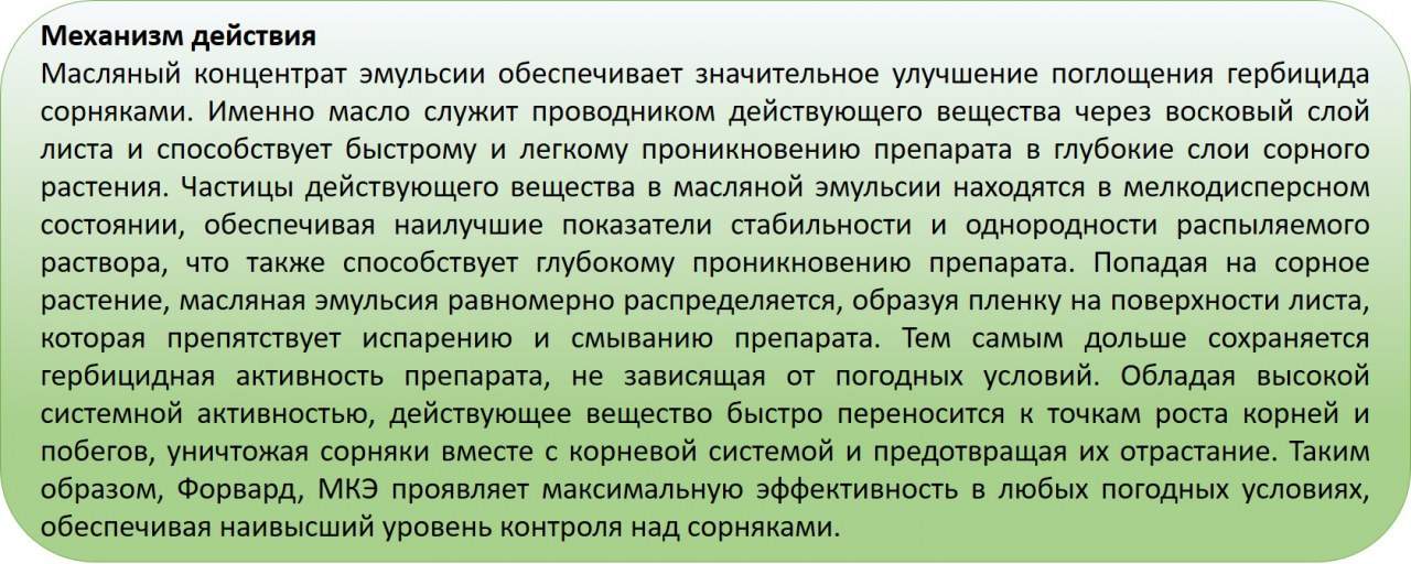 Первые признаки поражения сорняков наблюдаются в первые двое суток после обработки; благодаря удлиненному периоду воздействия может использоваться в широком диапазоне фаз развития сельскохозяйственных культур и сорняков; исключает повторное прорастание многолетних видов сорняков.