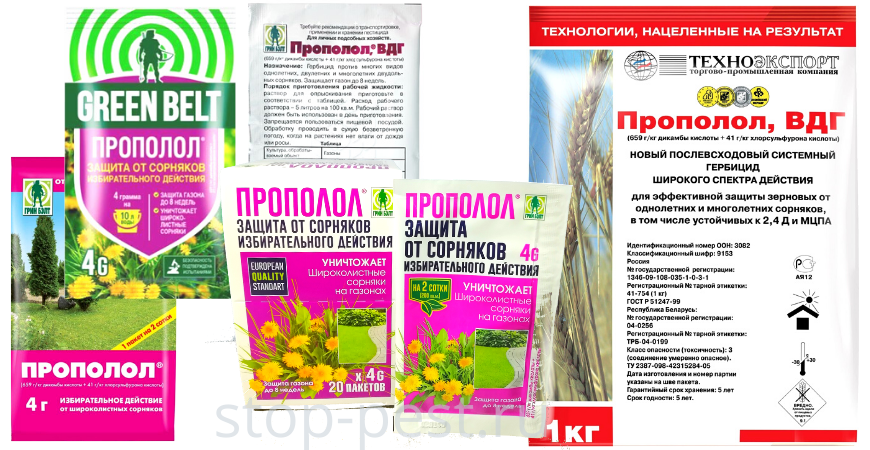 «Прополол» применяется как селективный гербицид для контроля многолетних корнеотпрысковых сорняков и сорняков, устойчивых к МЦПА и 2,4-Д. Защищает (не действует) на все злаковые растения, как культурные, так и сорные, устойчивы к дикамбе в фазе кущения.
