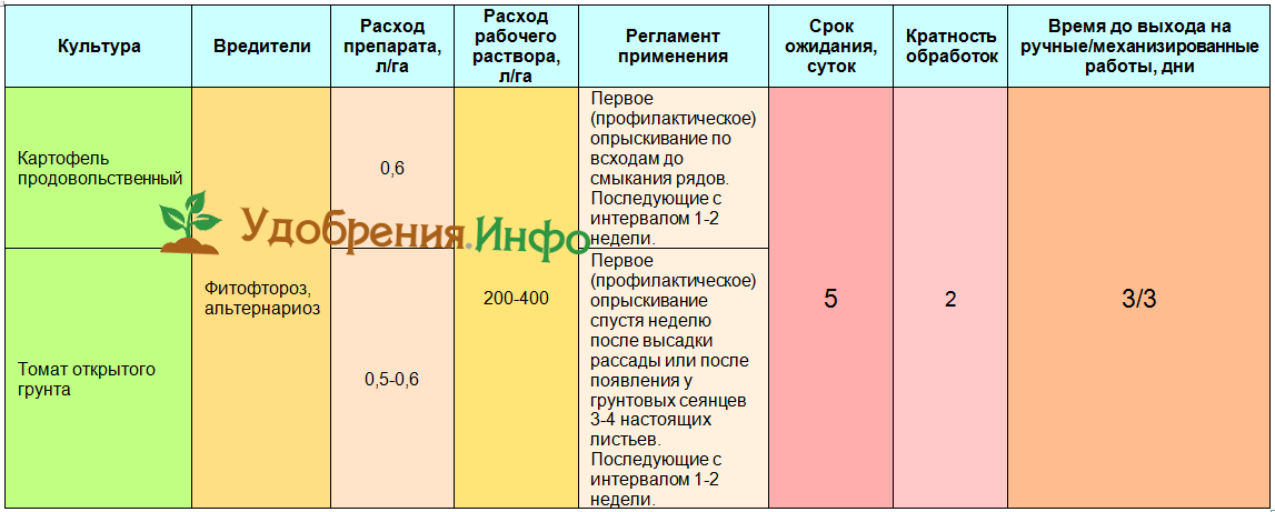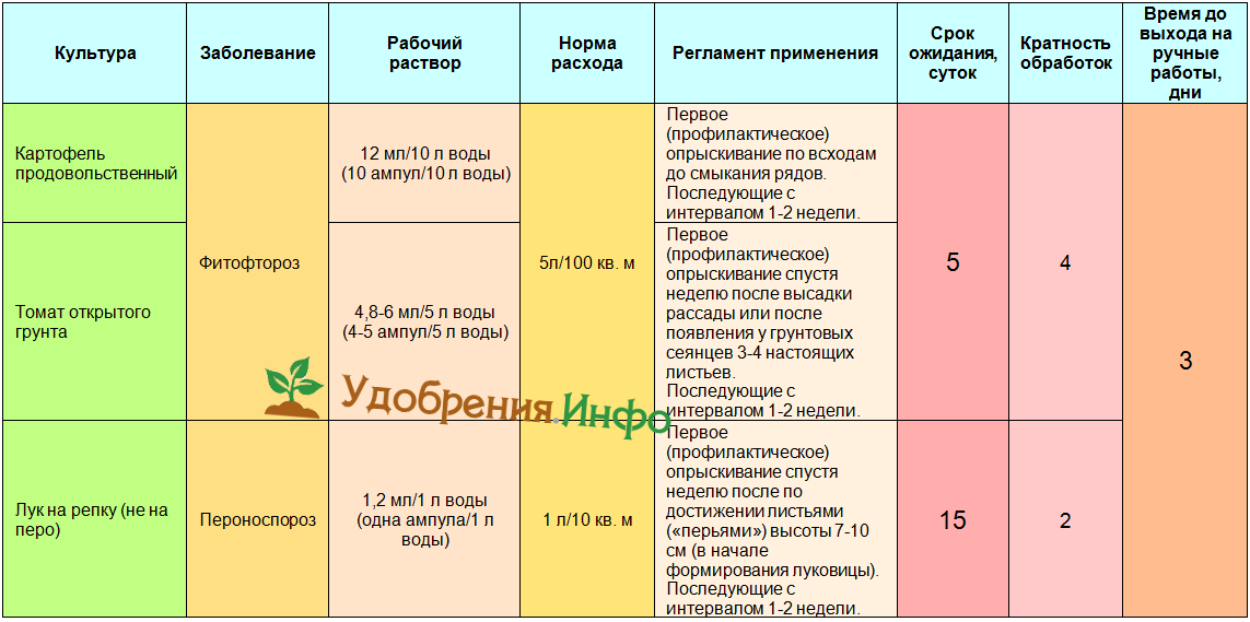 | Картофель | Фитофтороз | 12 мл на 10 л воды | 5л на 100м2 | Первое опрыскивание до смыкания рядом, повторные обработки с периодичностью 1-2 недели | 5 | 4 |