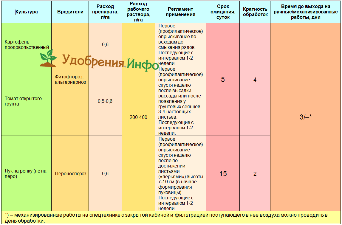 Инструкция по применению препарата Ревус Топ в агрохозяйствах (см. след. табл.) отличается исключением лука из числа целевых культур и уменьшенной кратностью обработок (т.е. меньшей их суммарной трудоемкостью), но увеличенным сроком выхода на механизированные работы.