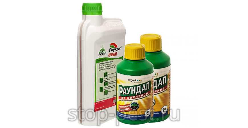 На посадках против многолетников применяют направленное опрыскивание весной и летом. При этом культурные растения желательно укрыть защитной пленкой. В 10 л воды вливают 120 мл Раундапа. Раствор такой же концентрации применяют для уничтожения многолетних сорняков в послеуборочный период. Расход — 5 л на 100 м кв.