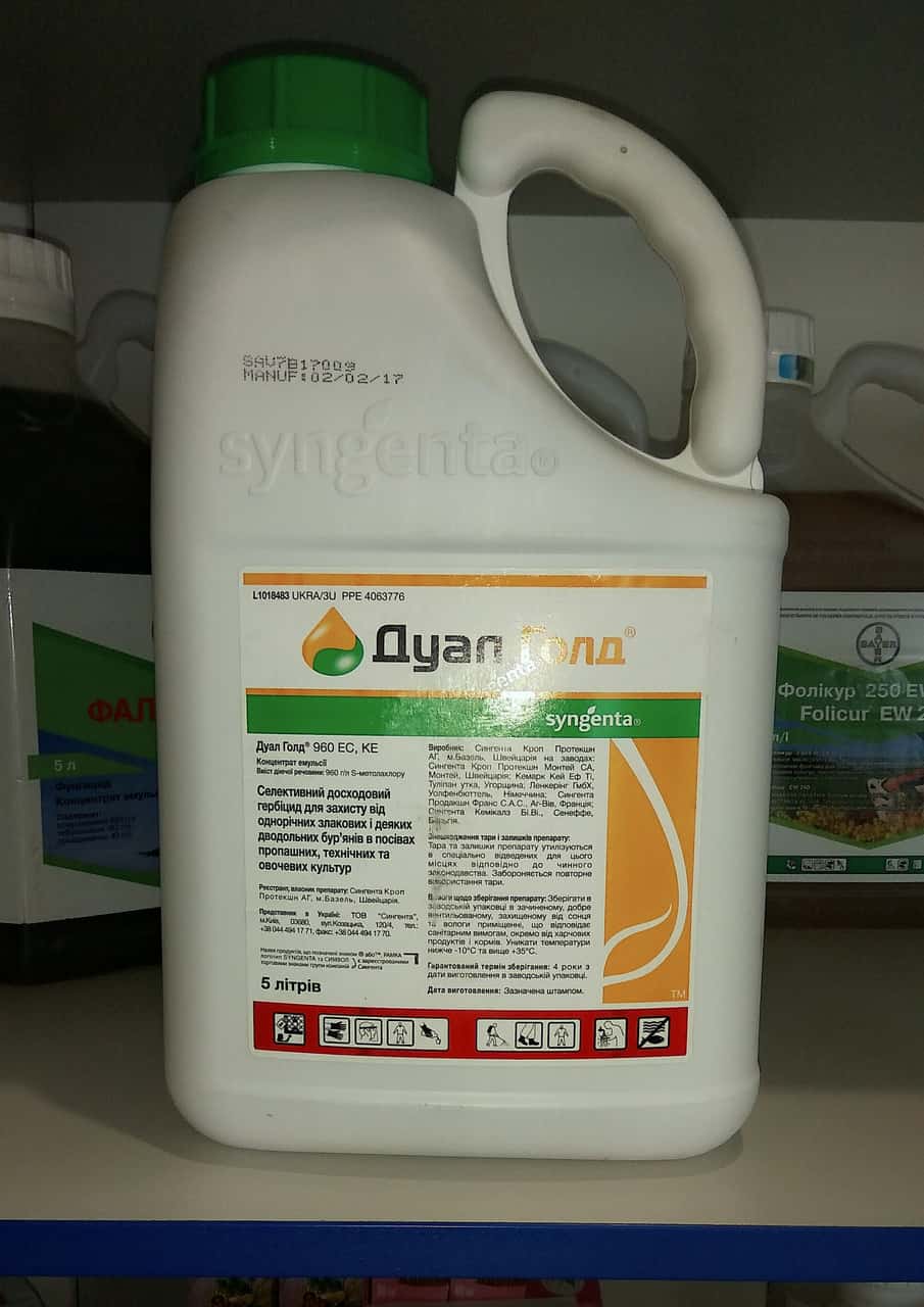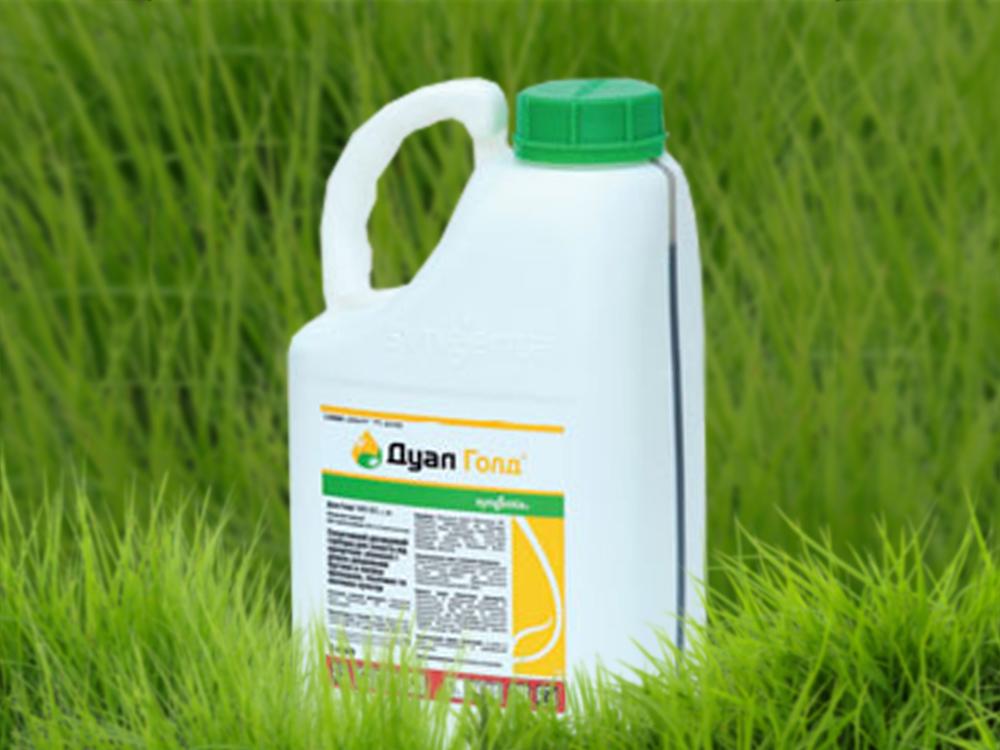 - Дуал Голд — гербицид, выпускаемы в форме концентрированной эмульсии, отнесен к системным составам с избирательным принципом действия. Чаще всего его применяют при обработке полей кукурузы и свеклы, рапса от однолетних и 2-дольных сорных трав.