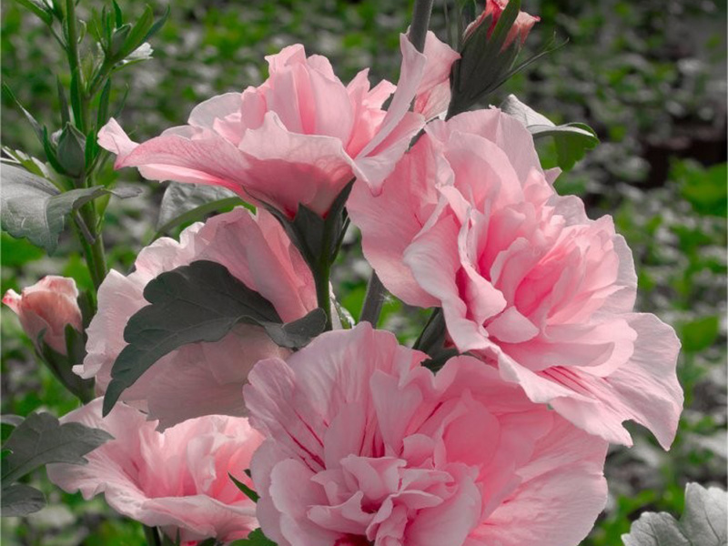 - Сирийский сорт гибискуса будет красиво и необычно сочетаться с разнообразными сортами роз. Этот невысокий куст красиво смотрится как в розарии, так и при украшении альпийских горок.