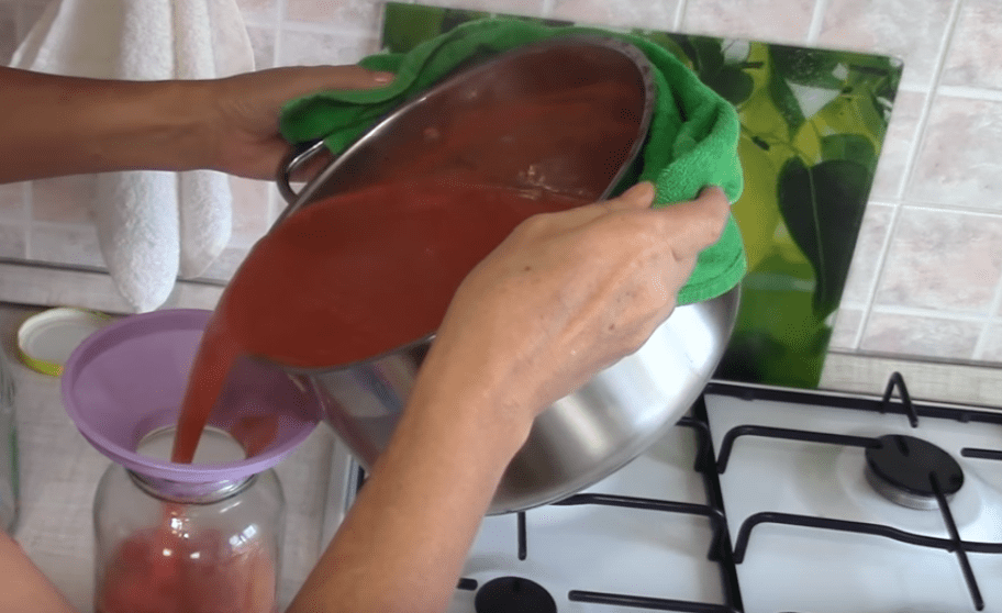 - Разлить в подготовленную посуду, не доливая до верха банки или бутылки 2 сантиметра.