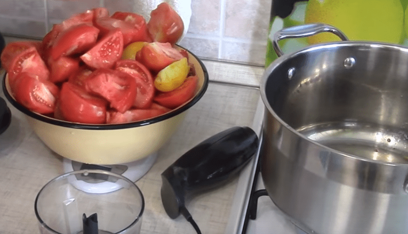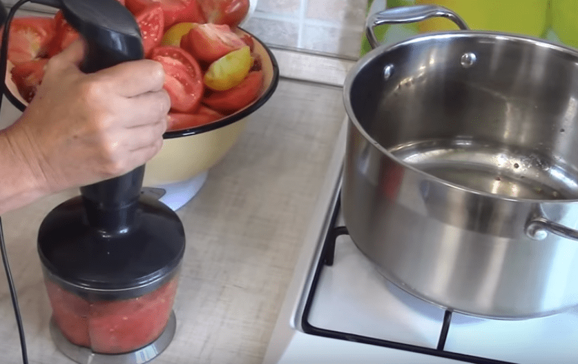 Отправляем помидоры в чашу- измельчитель по 3-4 штуки, прокручиваем секунд по 30 и выливаем получившийся сок с мякотью в глубокую кастрюлю.