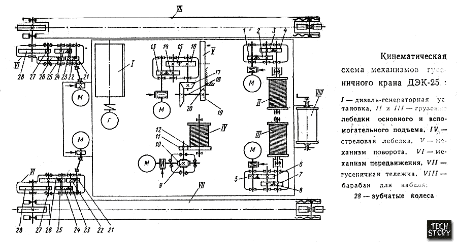 Исполнительные механизмы расположены на поворотной платформе. Главная и вспомагательная лебедки унифицированы. Движение барабану передается через редуктор типа РМ-500. При основной стреле грузовой канат навивается на оба барабана; при удлиненных стрелах на один барабан навивается канат основного подъема, а на другой — канат вспомогательного подъема. На механизм поворота движение от электродвигателя передается через редуктор РЦД-350. Барабан стреловой лебедки получает вращение от двухступенчатой передачи, состоящей из редуктора Ч-160 с самотормозящейся червячной передачей и открытой цилиндрической передачей. Механизм передвижения состоит из двух четырехступенчатых цилиндрических редукторов, движение к каждому подается от своего электродвигателя. Все рабочие операции на кране — подъем и опускание груза, вращение поворотной части, подъем и опускание стрелы, передвижение — осуществляются соответствующими механизмами с индивидуальными электроприводами, допускающими совмещение операций.