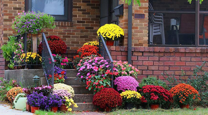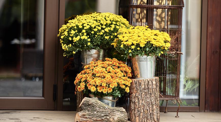 Хризантемами в горшках можно украсить парадный вход
