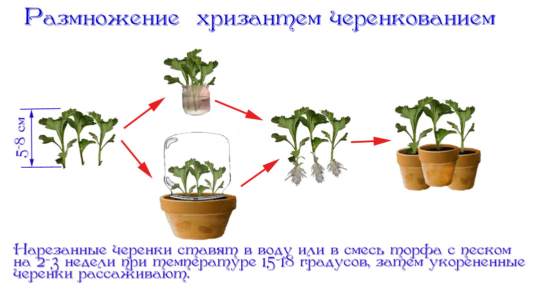 Допускается, чтобы хризантема мультифлора выращивалась в торфяных горшочках. Между собой черенки должны находиться на расстоянии не менее 10 см. Ёмкость необходимо поставить в тёплой комнате и регулярно поливать, черенки будут укореняться около 2 недель. Затем саженцы нужно разместить в отдельные ёмкости или сразу же помещать в открытый грунт.