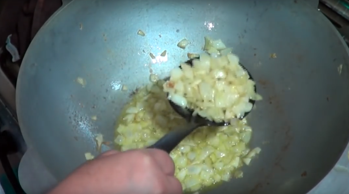 Когда лук прожарится, убираем его шумовкой, стараясь максимально оставить масло в сковороде.