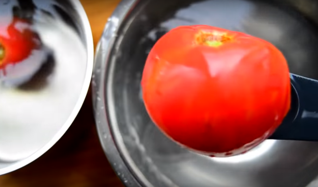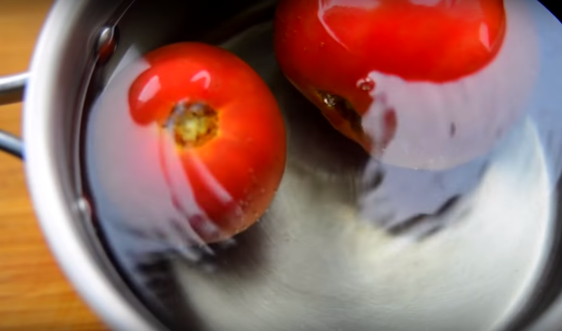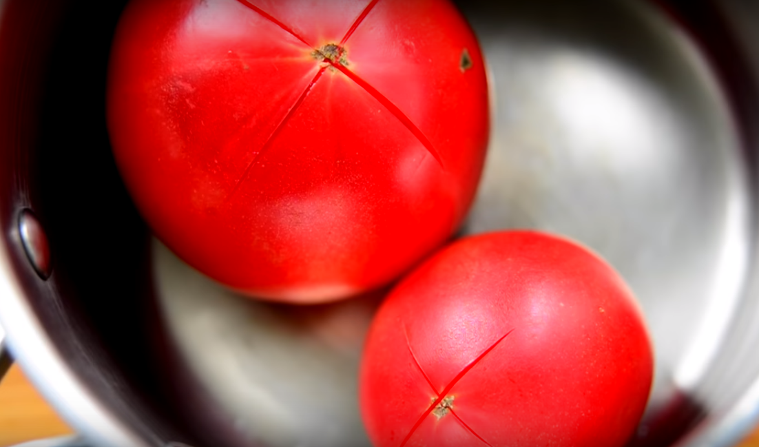 3.Помидоры нужны без кожицы. Чтобы ее легко можно было снять, сделайте сверху крестообразный надрез. Сложите томаты в глубокую миску и залейте кипятком. Оставьте на 3 минуты.