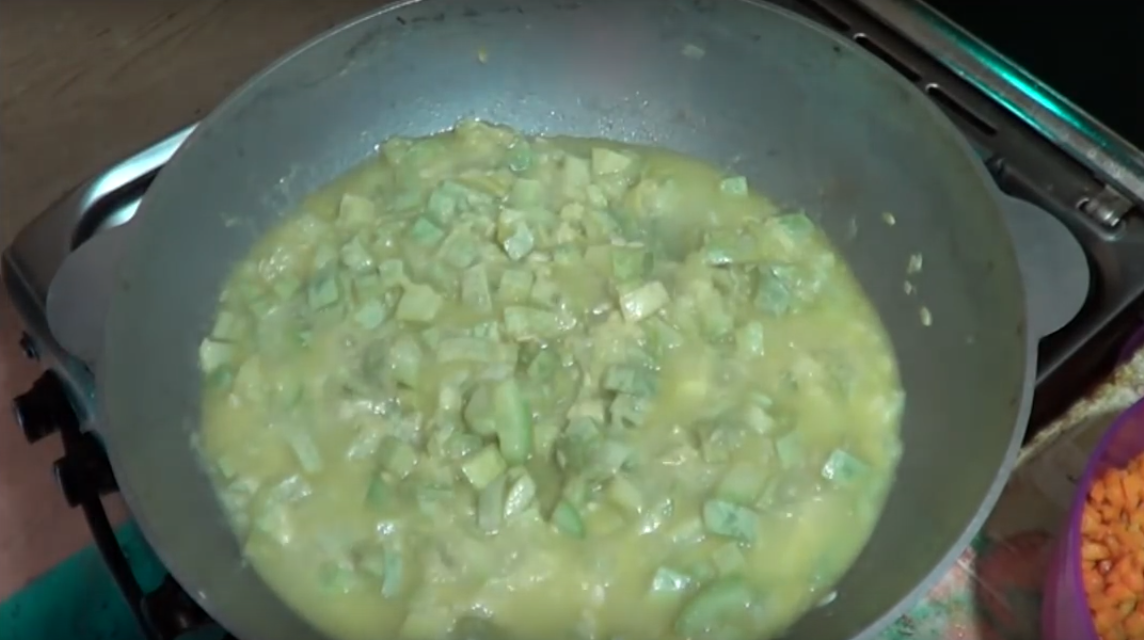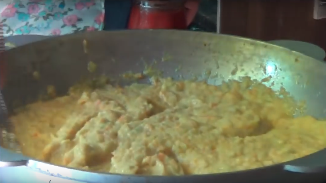 Все измельченные ингредиенты смешиваем, получается полужидкая кашка. Ее мы выливаем в сковороду на овощи.