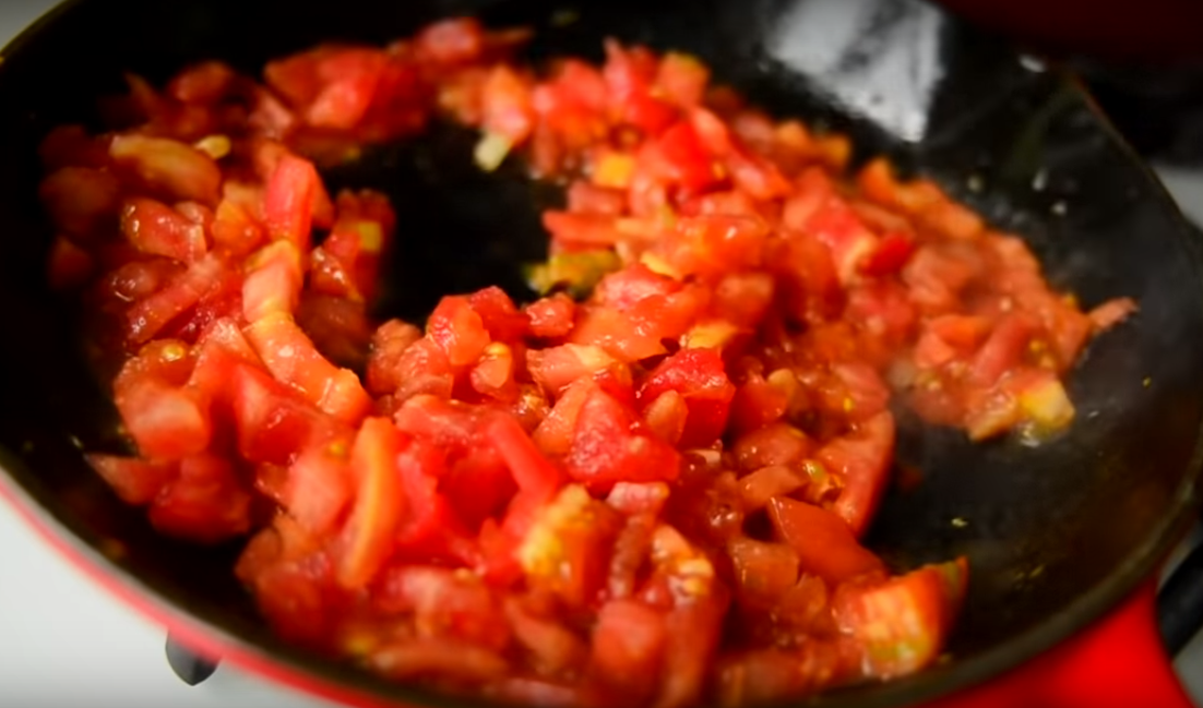 7.Добавьте помидоры, перемешайте и тушите 5 минут. Огонь должен быть маленьким.