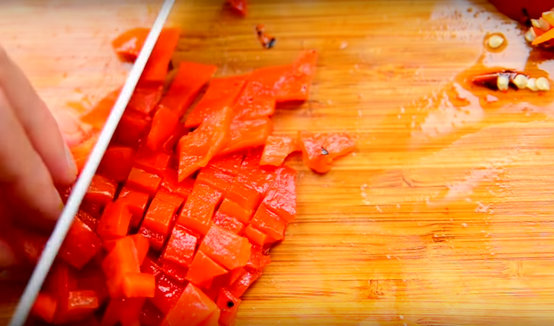 3. Далее остается покрошить мелко на кубики болгарский перец, снимите с него плодоножку и удалите семянки внутри.