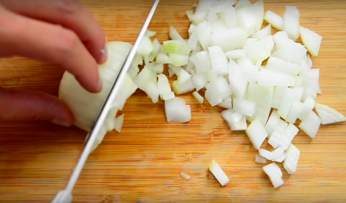 Лук очищаем. Шинкуем его мелким кубиком. Перекладываем в миску и тоже заливаем кипятком. Так он избавится от неприятной горечи. Пусть постоит буквально 3-5 минут. Затем сливаем жидкость полностью.