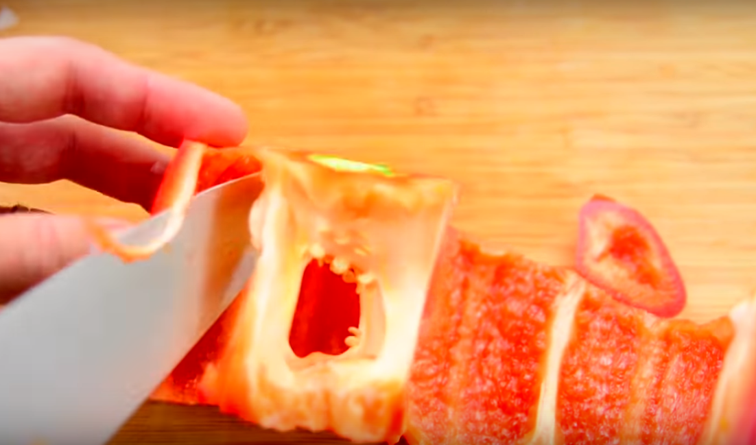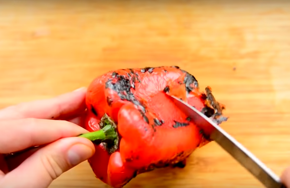 9.Отрежьте плодоножку у главного ингредиента и снимите кожицу. Также очистите перцы (и от семян, и от шкурки).