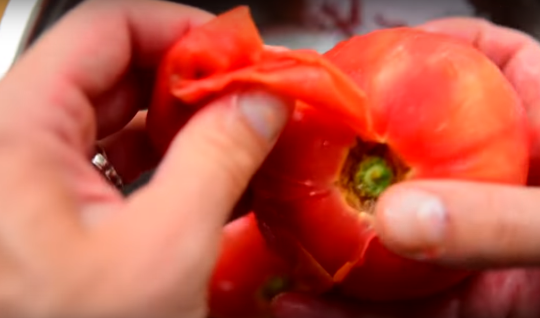 4.Теперь слейте горячую воду и залейте холодной. С помощью ножа снимите шкурку, это будет сделать легко. Также не забудьте вырезать плодоножки.
