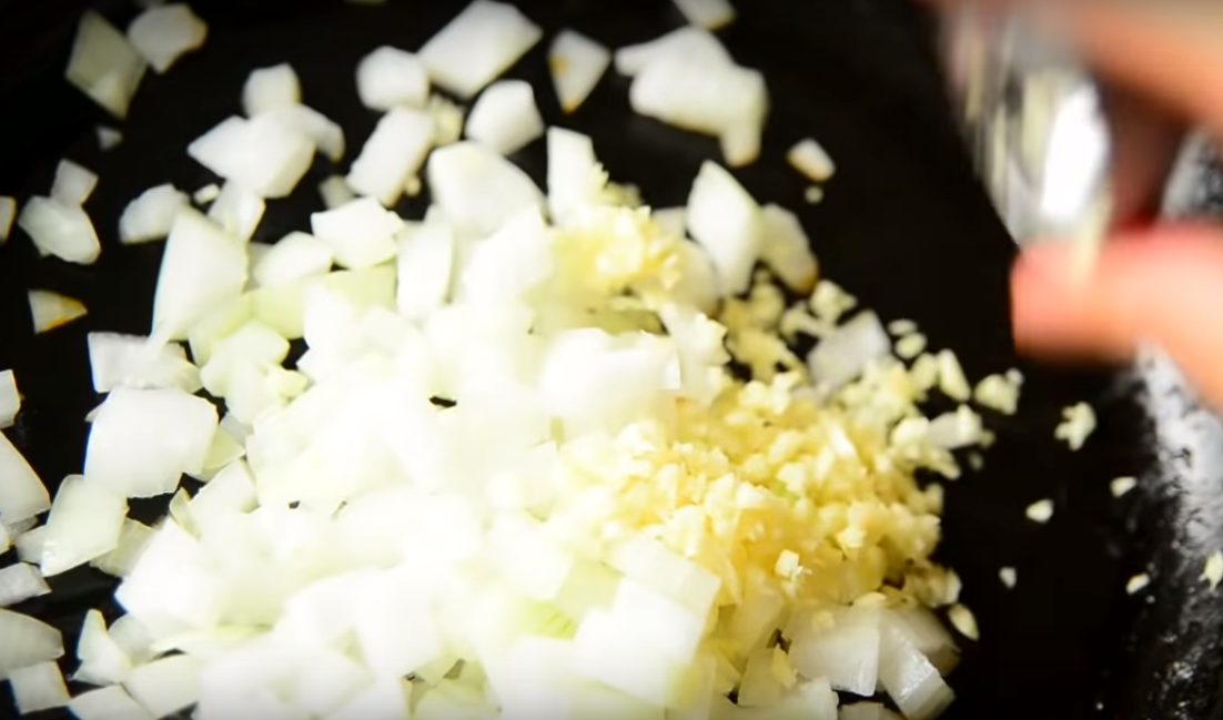 6.Разогрейте на сковороде с толстым дном 100 мл подсолнечного масла. Выложите в него лук и чеснок, обжарьте в течении нескольких минут до прозрачности.