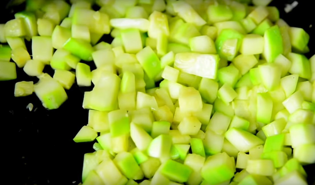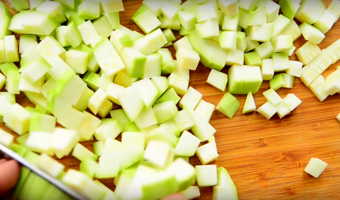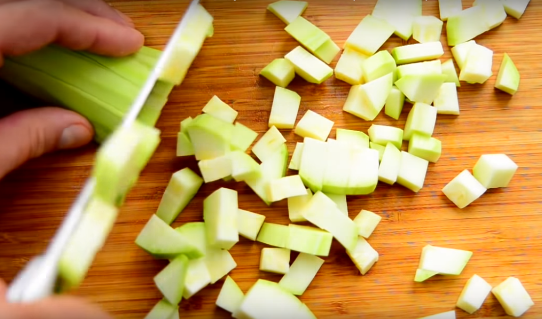 1. Подготовьте все овощи к работе, кабачки очистите от огрубевшей шкурки, если она есть. Если цукини у вас молоденькие и не переросшие, то можно и не удалять. Порубите на кубики.