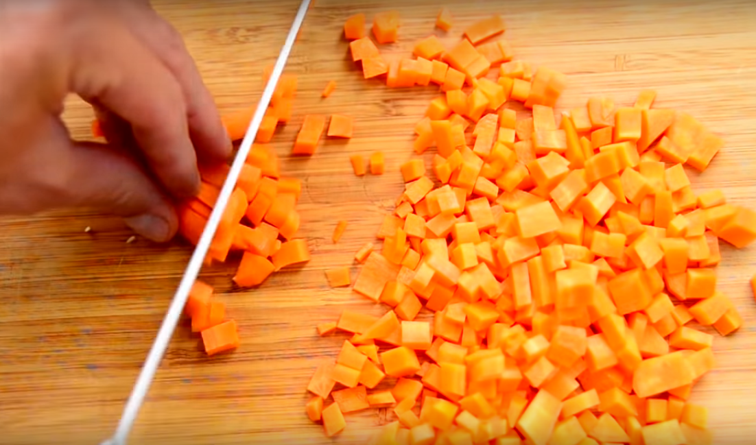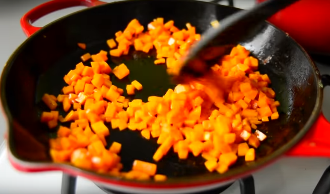 Сначала мелко нарезаем и обжариваем морковь до золотистого цвета на большом огне.