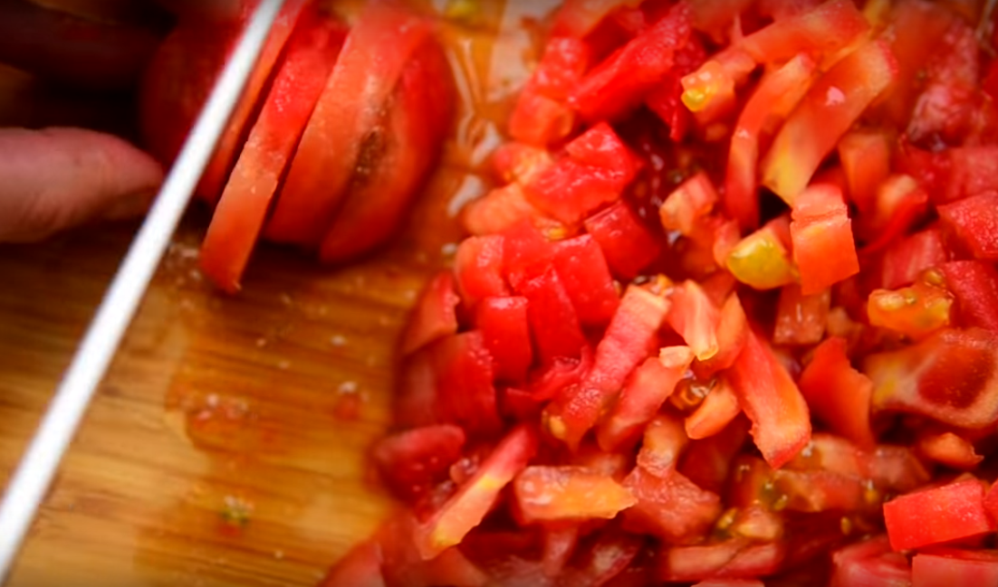 5.Нарежьте помидоры мелким кубиком или перебейте их в блендере.