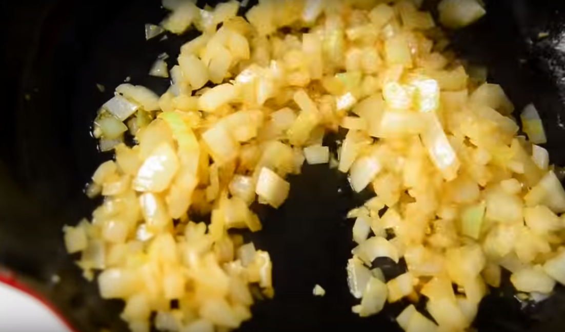 Следующим шагом кладем в сковороду лук, так же порезанный небольшими кубиками. Жарим до золотистой корочки на таком же сильном огне.